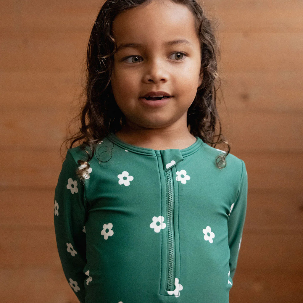 Protect little one and the environment with the ECONYL® regenerated nylon swimwear, which repurposes plastic waste rescued from oceans around the world. ECONYL® is comfortable and flexible to wear, dries quickly, and is UPF50+, offering the highest specification available to keep little one protected from the sun’s ultraviolet radiation. This unisex One Piece is perfect for long sunny days and water play. Featuring long sleeves, a classic splash short cut, and YKK zip opening at chest. Body is lined for comfort. Fabrics meet the Global Recycled Standard.