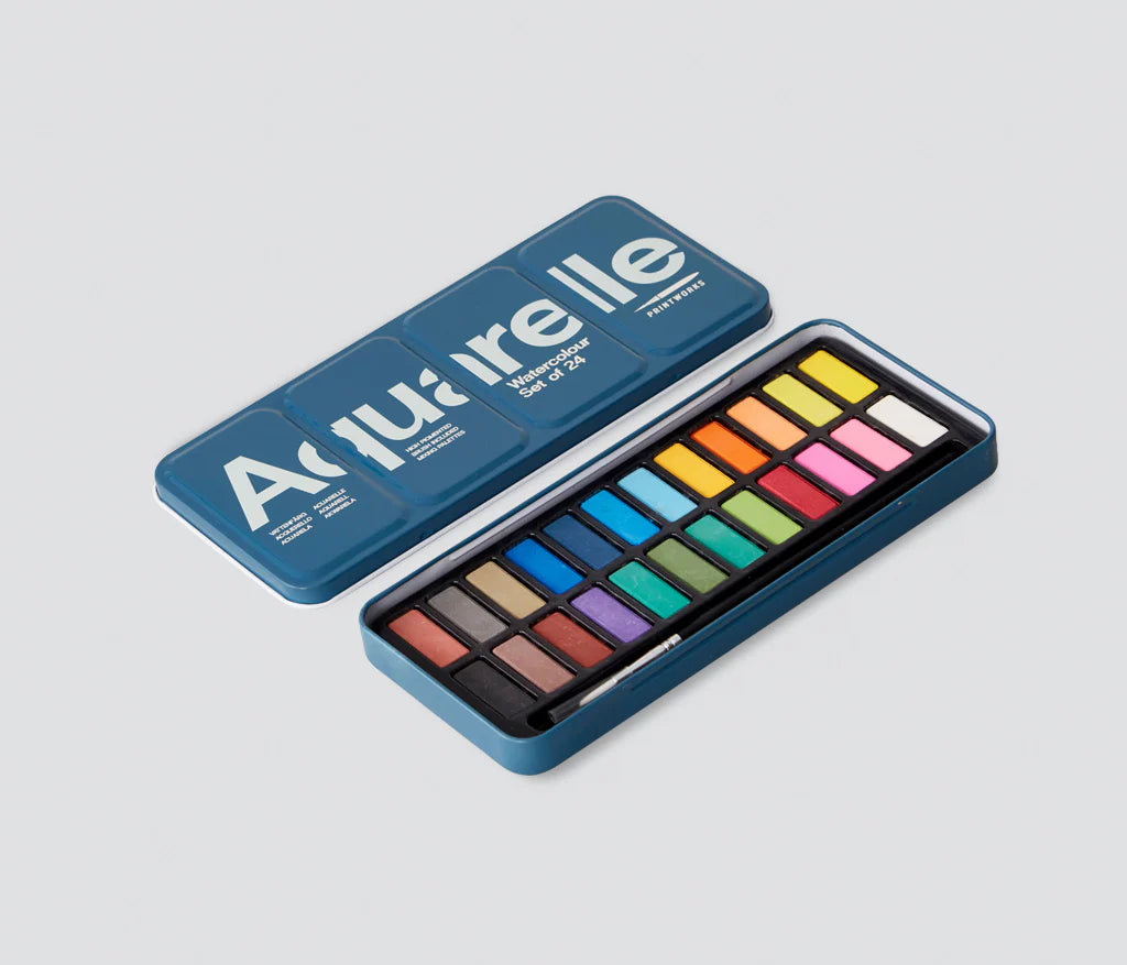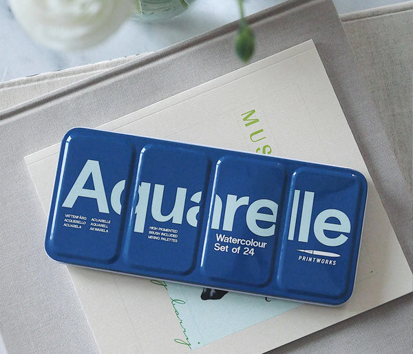 Discover Aquarelle Watercolors set, stored in an elegant box. With 24 high-pigmented colours, brush, and mixing palettes included, it's the perfect choice to elevate your artistic journey.