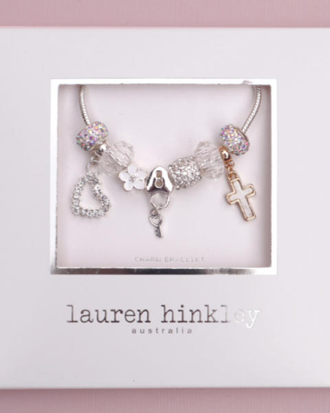 A combination of sweetness and elegance, our cross charm bracelet is classic by design and exudes charm and innocence. Silver, white, and gold are a perfect fit for a special occasion, whether for a baptism, First Communion, or just for everyday wear. This charm bracelet will undoubtedly become a special keepsake for whoever owns it, particularly because of the beautiful mother of pearl cross charm included.